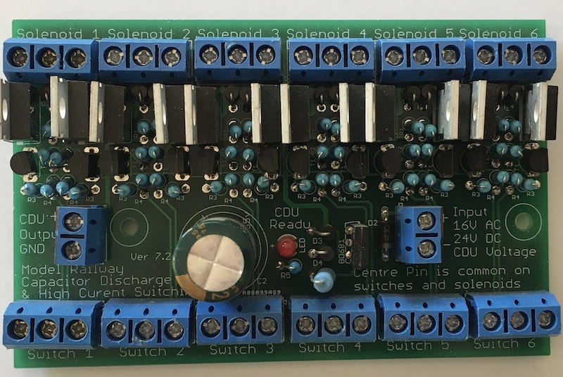 One of the CDU modules available has two CDU’s on the one board. This is useful for three way turnouts to reduce the chance of damage. You can configure three switches to set each of the three roads. Both solenoids then operate at the same time from separate CDU power. The dual CDU model can also be used to simplify crossovers, you could operate both turnouts from the one switch.